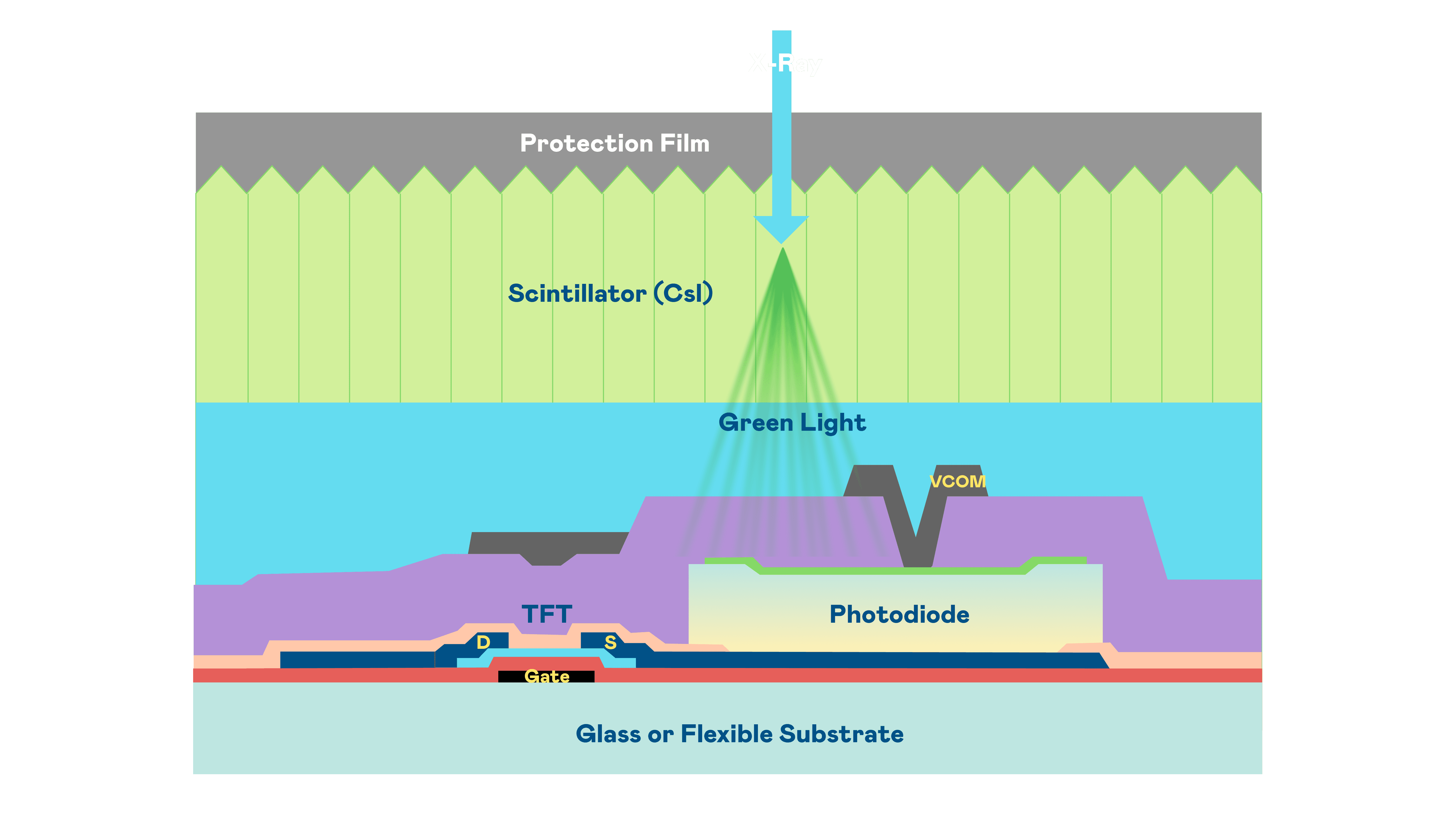 万利的X光影像感测阵列使用薄膜电晶体 (TFT) 作为每个像素的读取开关,,搭配光电二极体(Photodiode)的光电转换元件,,,,用以感测X光影像讯号。。